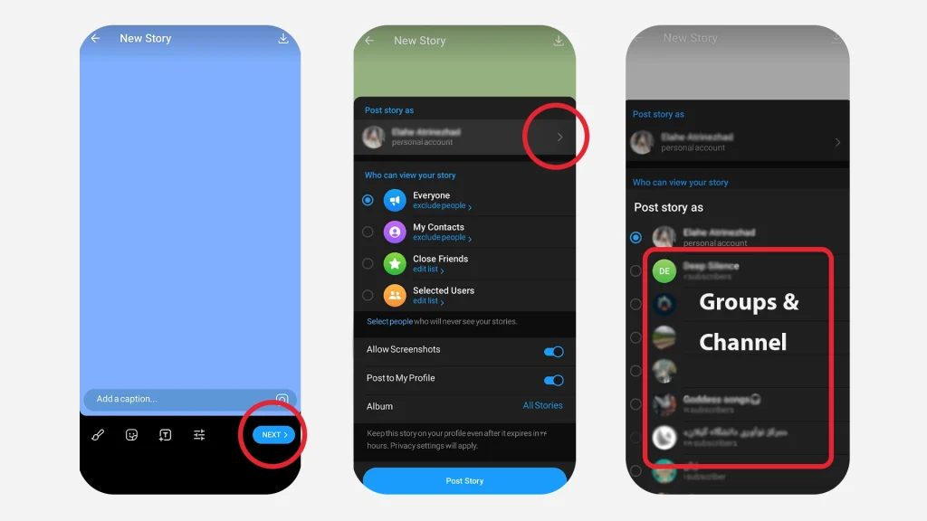 (Pro Tip): When you tap the main camera icon to post a personal story, look at the top left corner of the screen before publishing. You will see your profile picture. Tap on it, and Telegram will let you switch to any channel or group where you have story-posting rights. Your story will be posted on behalf of that channel, not you personally.